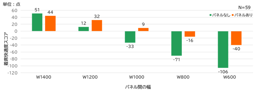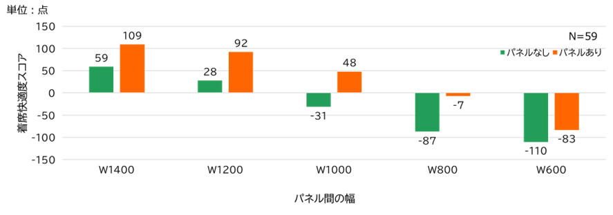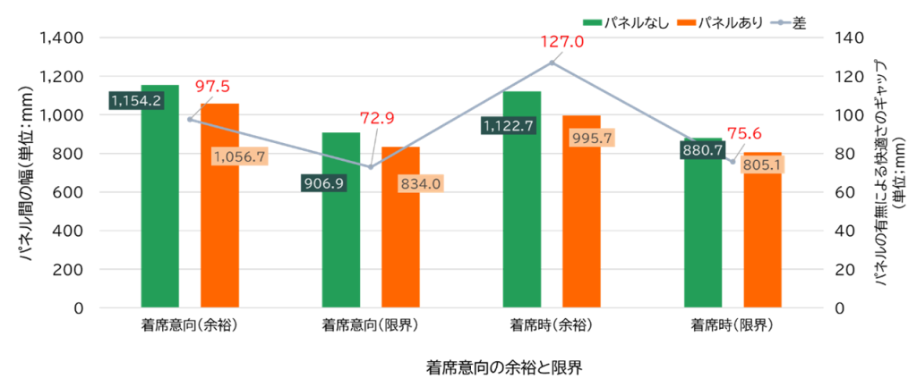 座って余裕を感じる間隔ではパネルの有無により127mmの差があり、パネルの設置により1000mmでも「余裕」と感じられる。