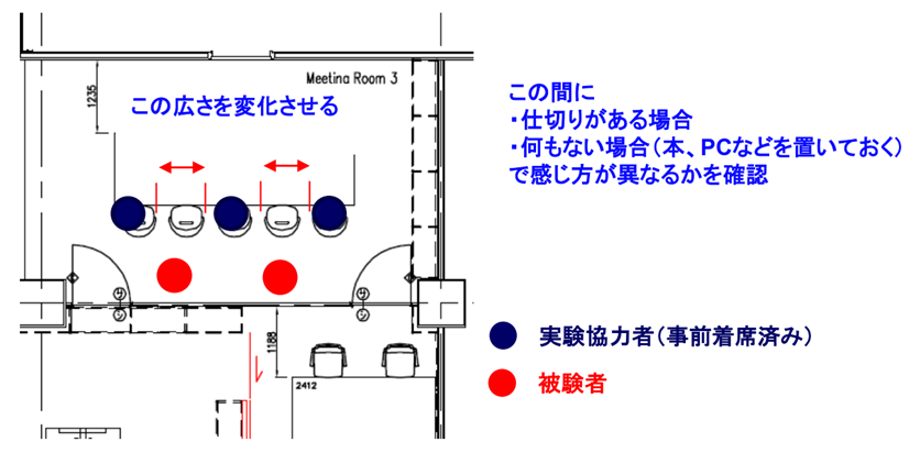 方法:被験者の座席の左右に実験協力者が着席している状況を設定。左右の席間隔を変化させ、実験協力者の着席前/着席後で許容できる広さを調査した。パネルの有無でその間隔に変化があるかどうかを検証した。また、最後に被験者自身が「余裕があると感じる間隔」と「限界と感じる間隔」を実際に設定し、計測を行った。