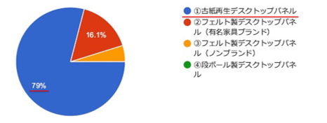 79%が①古紙再生(ドライファイバーテクノロジー)デスクトップパネルを選択。ただしサステナブルな価値があっても段ボールは選ばれない。